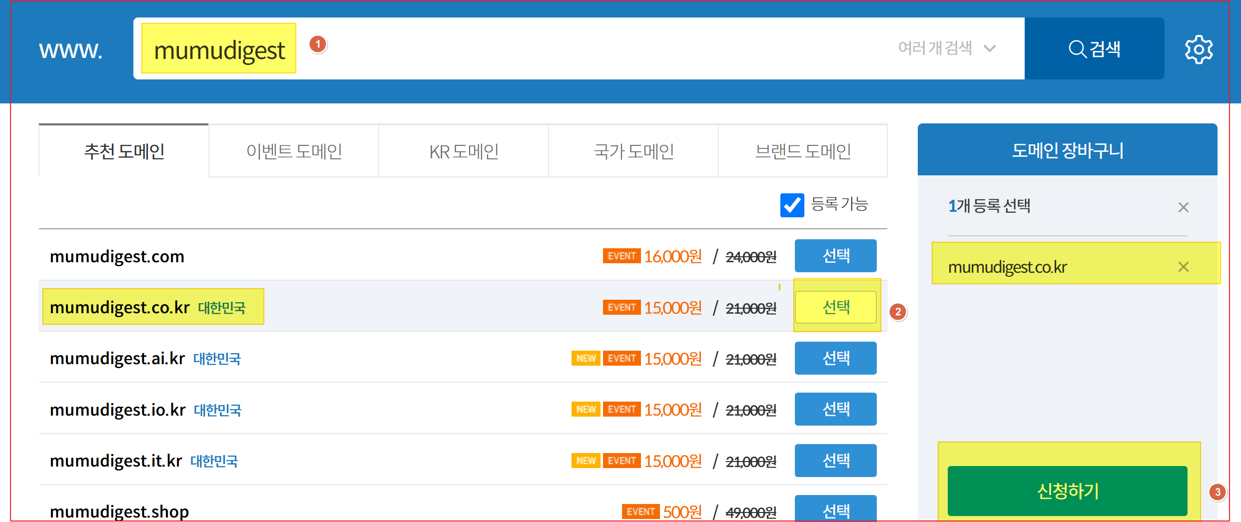 • 참고로 아래 이미지에서는 mumudigest.kr 도메인을 제가 이미 구매한 상태라 검색에 보이지 않습니다.