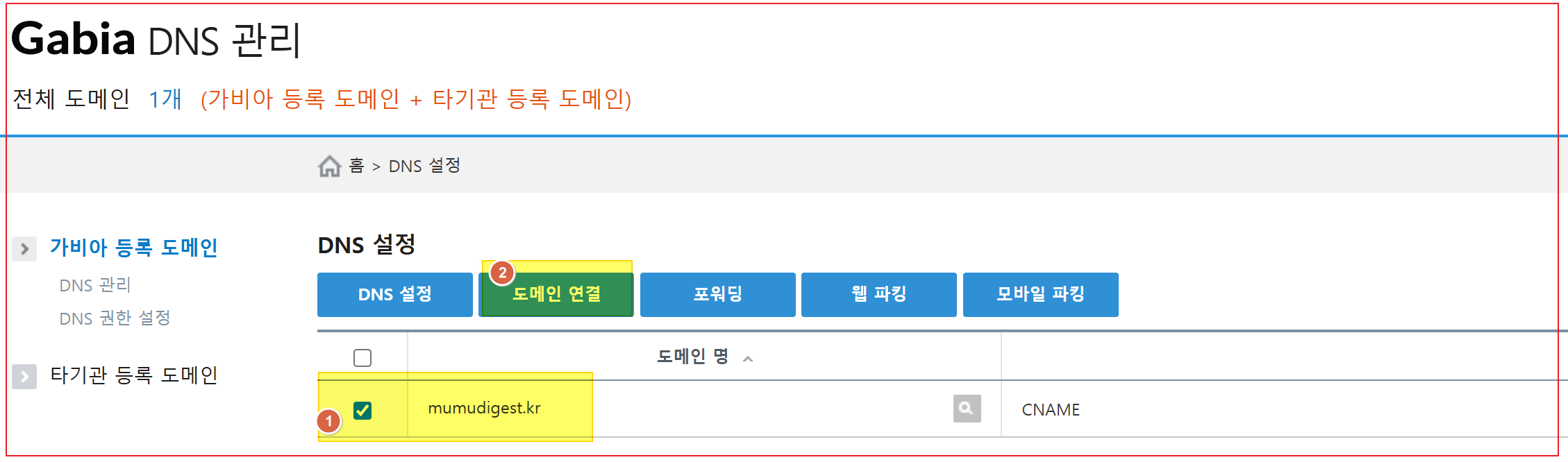 • 구매한 도메인(예:mumudigest.kr 을 선택하고 위에 '도메인 연결' 버튼을 누릅니다.