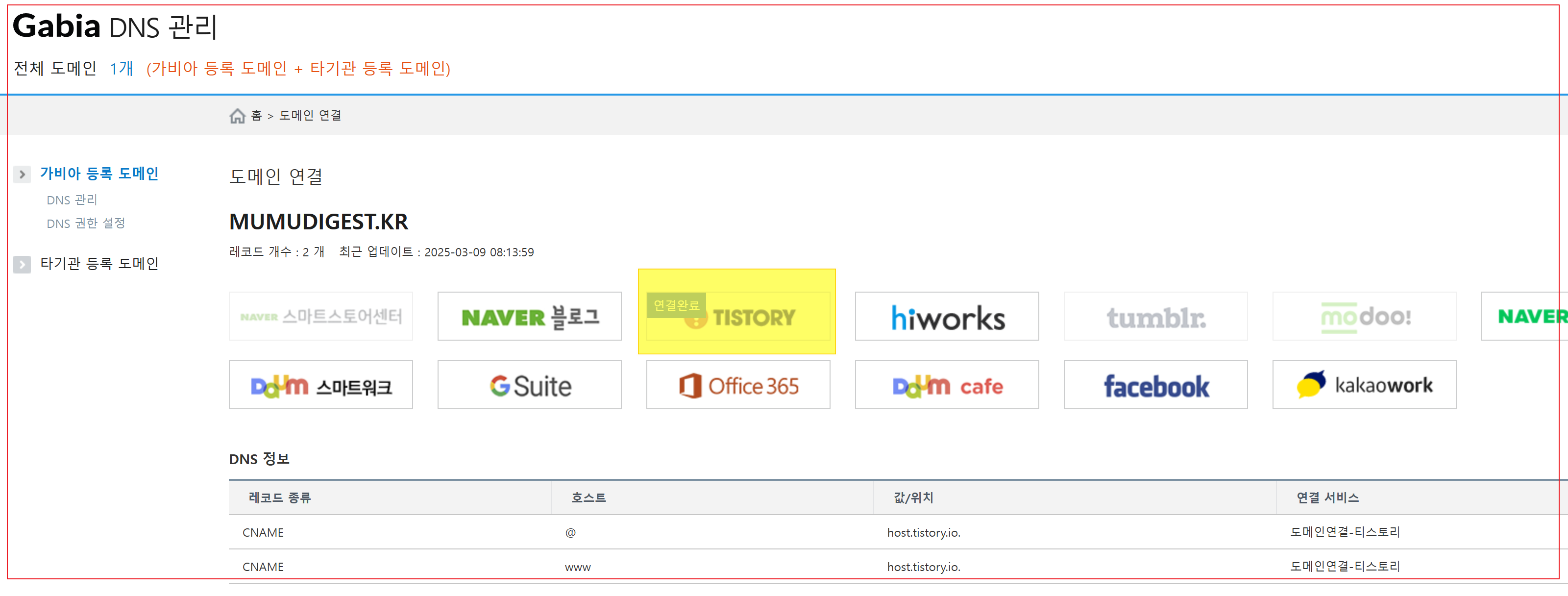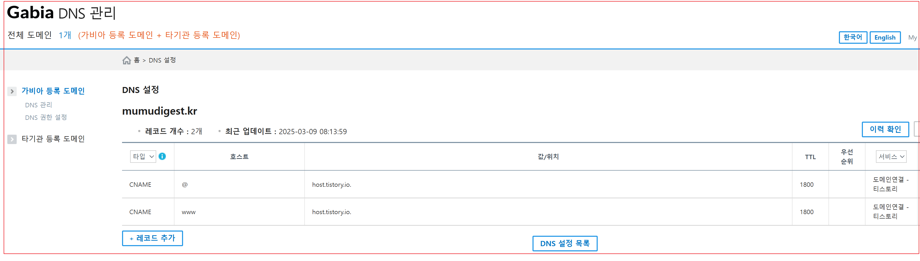 블로그를 운영하면서 자체 도메인을 사용하면 브랜드 신뢰도를 높이고, 방문자들에게 더 깔끔한 URL을 제공할 수 있습니다. 특히 티스토리를 사용할 경우 기본 제공되는 서브도메인보다는 맞춤형 도메인을 설정하는 것이 SEO 측면에서도 유리합니다. 그래서 국내 도메인 등록 서비스 중 하나인 가비아(Gabia)를 이용하여 'mumudigest.kr'이라는 도메인을 구입하게 되었습니다. 그렇게 어려운 과정은 아니지만 저 처럼 가비아(Gabia) 를 이용해 도메인을 구매해서 티스토리에 연결하려고 하는 분들에게 조금이나마 도움이 되었으면 하는 마음에 블로그 글을 작성해 봅니다.