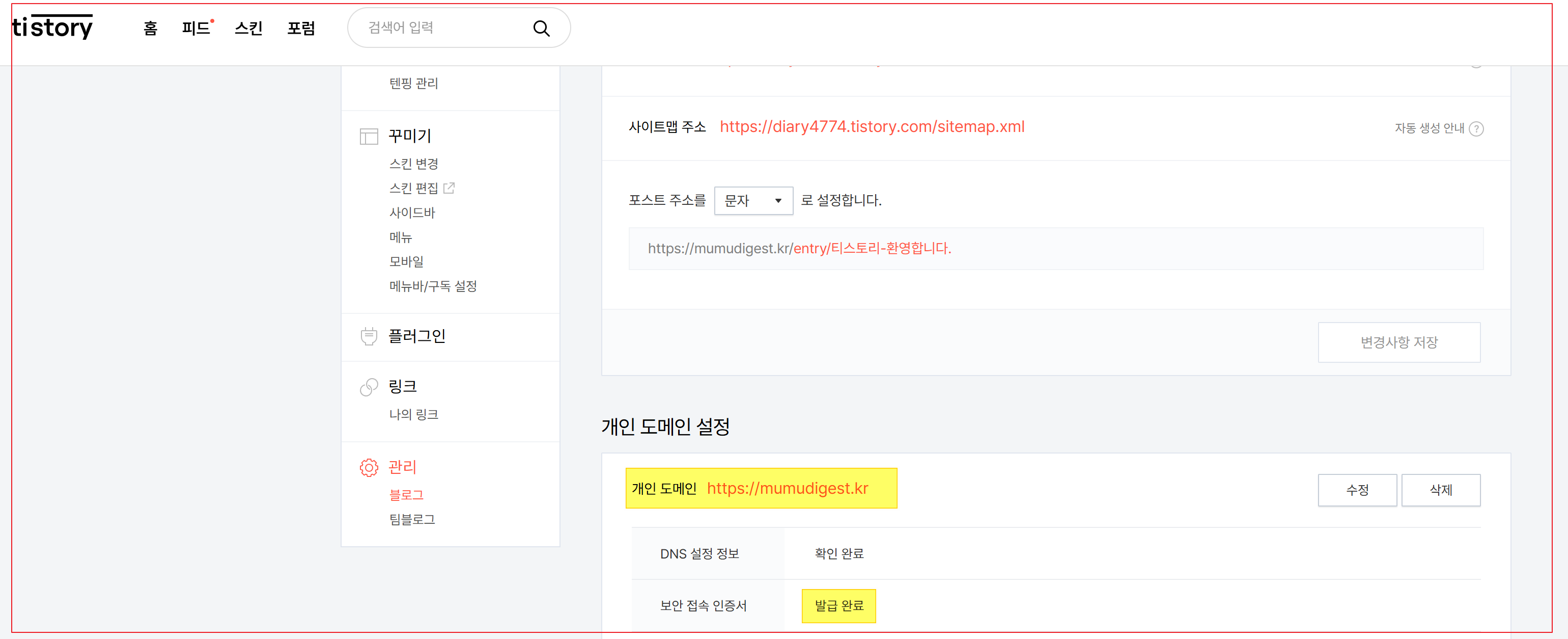 • 사용자 도메인을 입력하는 항목에 구입한 도메인(구매한 개인도메인: mumudigest.kr)을 입력합니다.