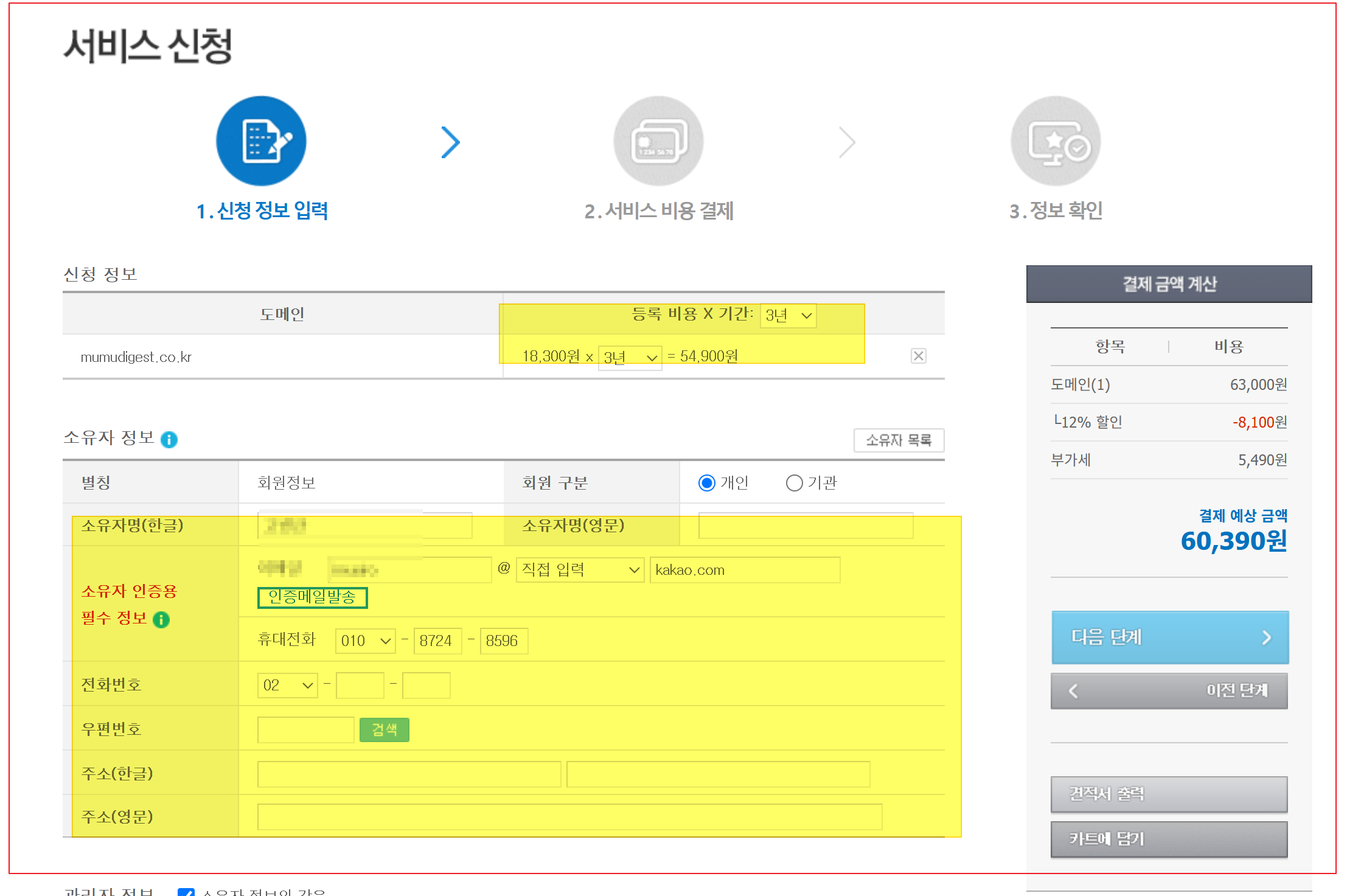 • 도메인 소유자 정보 및 관리 정보를 입력합니다.