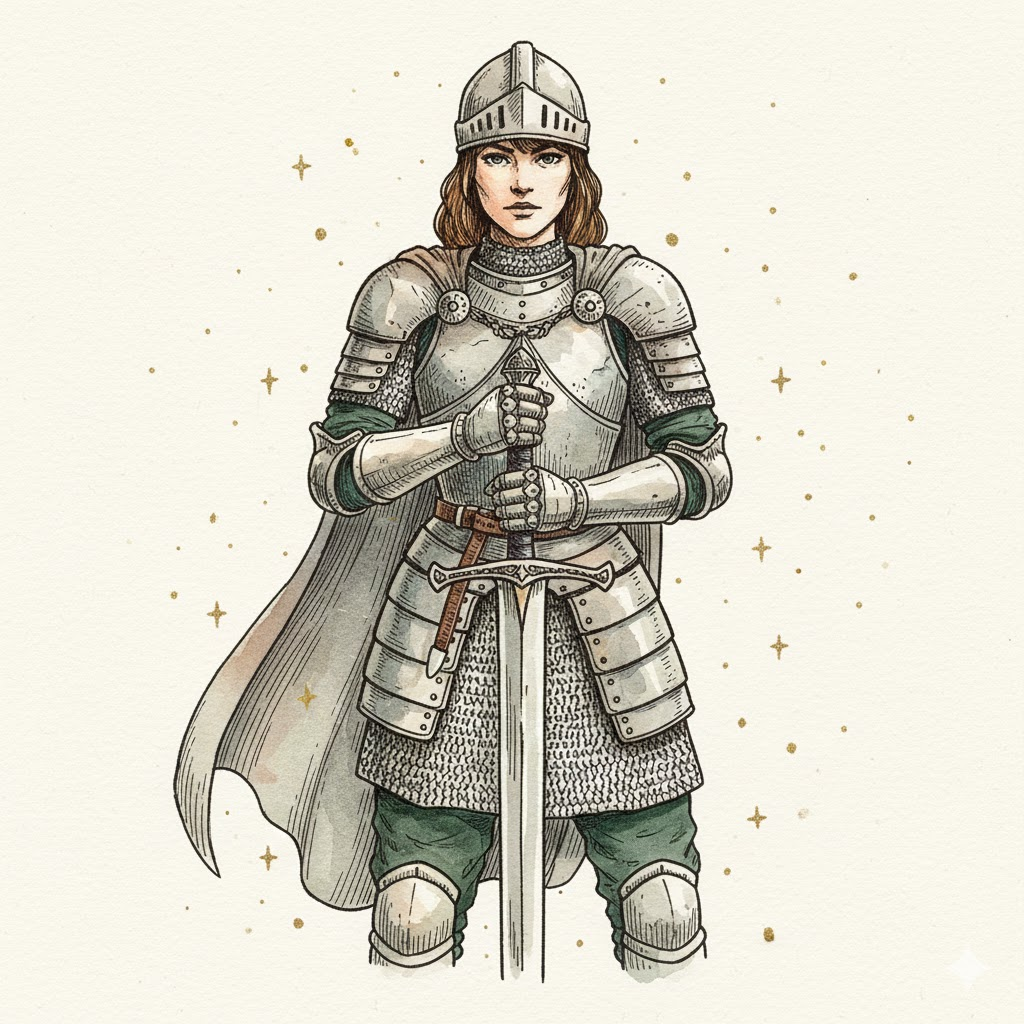 - [A brave female knight holding a sword], hand-drawn pen and ink illustration, vintage storybook aesthetic, etching style with fine cross-hatching details, soft muted watercolor coloring, delicate line art, minimalist white background, subtle sparkles and stars scattered around, high quality, gentle and nostalgic atmosphere.