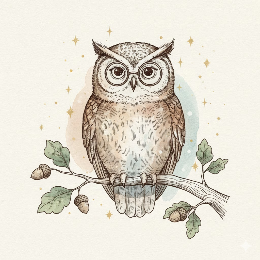- [An owl wearing glasses sitting on a branch], hand-drawn pen and ink illustration, vintage storybook aesthetic, etching style with fine cross-hatching details, soft muted watercolor coloring, delicate line art, minimalist white background, subtle sparkles and stars scattered around, high quality, gentle and nostalgic atmosphere.