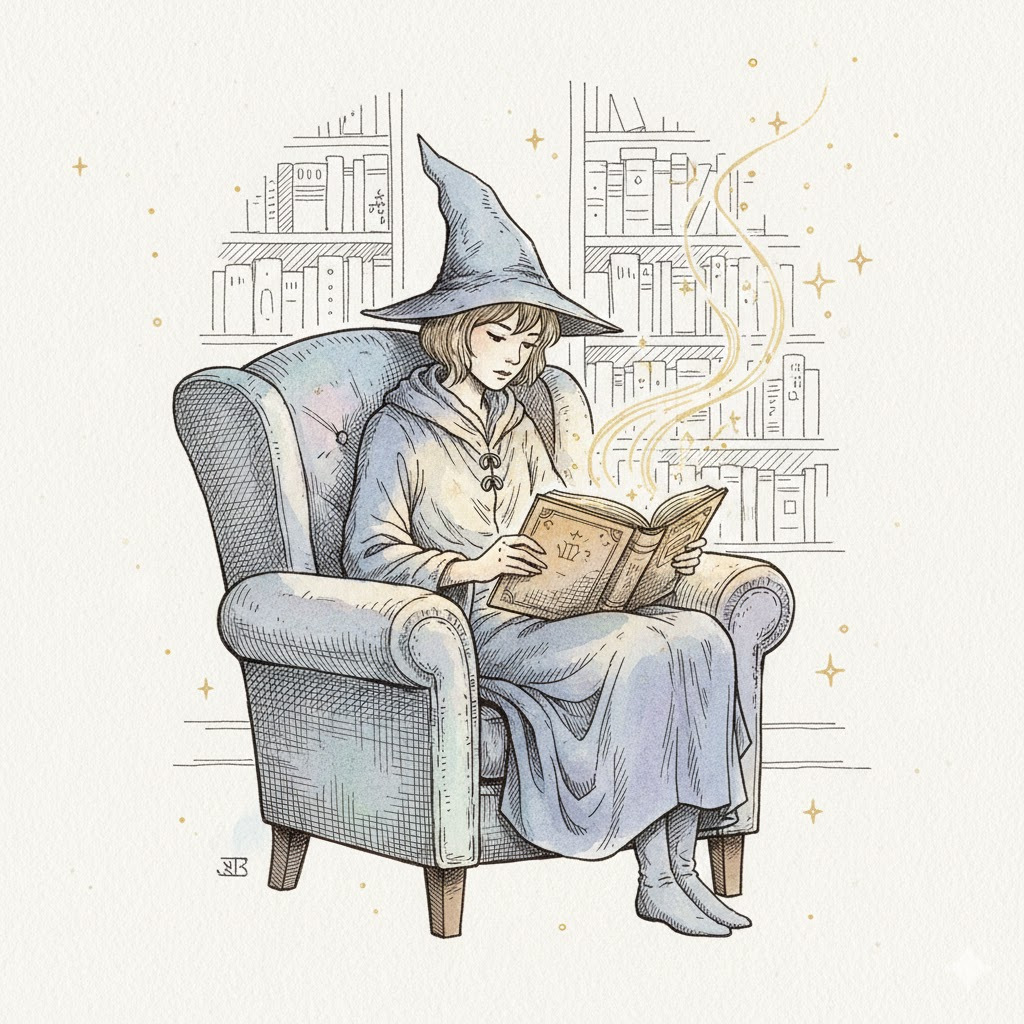 - [A young wizard reading a magical book], hand-drawn pen and ink illustration, vintage storybook aesthetic, etching style with fine cross-hatching details, soft muted watercolor coloring, delicate line art, minimalist white background, subtle sparkles and stars scattered around, high quality, gentle and nostalgic atmosphere.