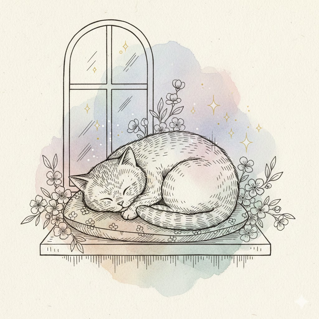 - [A cute cat sleeping on a windowsill], hand-drawn pen and ink illustration, vintage storybook aesthetic, etching style with fine cross-hatching details, soft muted watercolor coloring, delicate line art, minimalist white background, subtle sparkles and stars scattered around, high quality, gentle and nostalgic atmosphere.