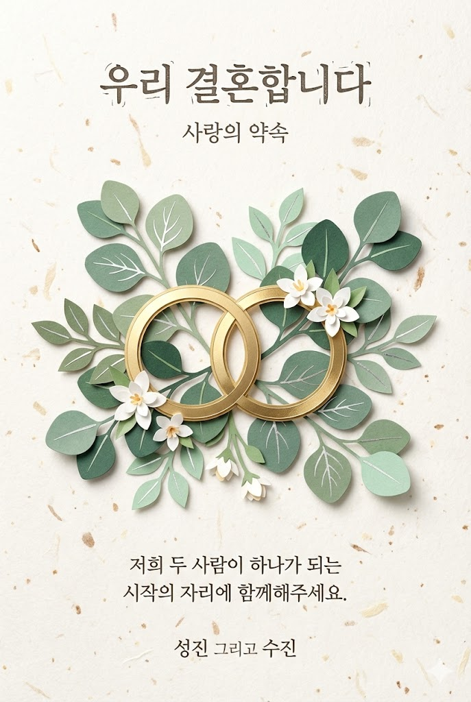 Design a premium and minimalist digital card with a "Handmade Paper-cut & Die-cut" aesthetic, inspired by the style of layered paper art. The image must be a direct, flat view of the card design itself, with absolutely no surrounding background context or environment. Full-bleed edge-to-edge digital graphic card illustration. No borders, no margins, no external background. The overall mood is sophisticated, clean, and artistic, combining a warm handmade feel with modern editorial design. Card Surface & Texture (All text must be rendered in an artisanal calligraphic brush script or hand-carved block print style, complementing the paper craft aesthetic): Card Surface: The card itself has a luxurious handmade ivory paper with delicate organic speckles. Header: At the top center, place a clean title: 우리 결혼합니다. Below it, add a small, sophisticated subtitle: 사랑의 약속. Central Illustration: A detailed layered paper-cut style illustration depicted flat on the card. The piece should be two interlocking golden rings surrounded by layered eucalyptus leaves and tiny white jasmine flowers. Message Body: In the lower center, include a heartfelt message: "저희 두 사람이 하나가 되는 시작의 자리에 함께해주세요.". Footer: At the very bottom, add the sender's name or brand name in a subtle signature style: "성진 그리고 수진". Style Notes: Flat lay design, isolated card view, layered paper-cut art, die-cut shapes, vibrant yet refined colors, visible paper depth, clean margins, artistic composition. --ar 2:3