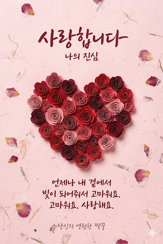Design a premium and minimalist digital card with a "Handmade Paper-cut & Die-cut" aesthetic, inspired by the style of layered paper art. The image must be a direct, flat view of the card design itself, with absolutely no surrounding background context or environment. Full-bleed edge-to-edge digital graphic card illustration. No borders, no margins, no external background. The overall mood is sophisticated, clean, and artistic, combining a warm handmade feel with modern editorial design. Card Surface & Texture (All text must be rendered in an artisanal calligraphic brush script or hand-carved block print style, complementing the paper craft aesthetic): Card Surface: The card itself has a soft pink handmade paper with real dried flower petals embedded. Header: At the top center, place a clean title: 사랑합니다. Below it, add a small, sophisticated subtitle: 나의 진심. Central Illustration: A detailed layered paper-cut style illustration depicted flat on the card. The piece should be a large heart made of dozens of tiny multi-layered paper roses in various shades of red. Message Body: In the lower center, include a heartfelt message: "언제나 내 곁에서 빛이 되어줘서 고마워요. 사랑해요.". Footer: At the very bottom, add the sender's name or brand name in a subtle signature style: "당신의 영원한 짝꿍". Style Notes: Flat lay design, isolated card view, layered paper-cut art, die-cut shapes, vibrant yet refined colors, visible paper depth, clean margins, artistic composition. --ar 2:3