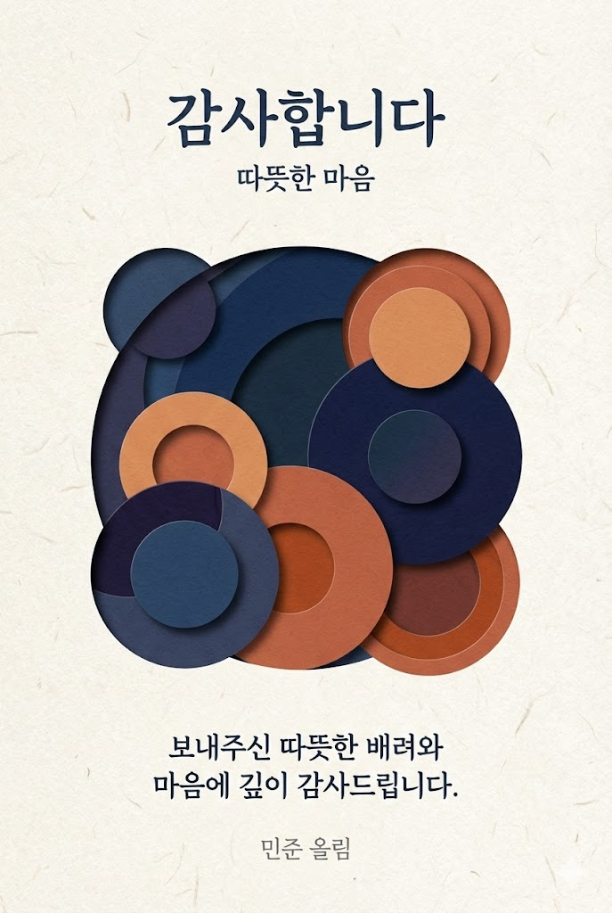 Design a premium and minimalist digital card with a "Handmade Paper-cut & Die-cut" aesthetic, inspired by the style of layered paper art. The image must be a direct, flat view of the card design itself, with absolutely no surrounding background context or environment. Full-bleed edge-to-edge digital graphic card illustration. No borders, no margins, no external background. The overall mood is sophisticated, clean, and artistic, combining a warm handmade feel with modern editorial design. Card Surface & Texture (All text must be rendered in an artisanal calligraphic brush script or hand-carved block print style, complementing the paper craft aesthetic): Card Surface: The card itself has a distinct Japanese Washi texture with subtle fibers and a warm off-white tone. Header: At the top center, place a clean title: 감사합니다. Below it, add a small, sophisticated subtitle: 따뜻한 마음. Central Illustration: A detailed layered paper-cut style illustration depicted flat on the card. The piece should be an abstract composition of overlapping geometric circles in deep blues and terracotta oranges, resembling a modern art piece. Message Body: In the lower center, include a heartfelt message: "보내주신 따뜻한 배려와 마음에 깊이 감사드립니다.". Footer: At the very bottom, add the sender's name or brand name in a subtle signature style: "민준 올림". Style Notes: Flat lay design, isolated card view, layered paper-cut art, die-cut shapes, vibrant yet refined colors, visible paper depth, clean margins, artistic composition. --ar 2:3