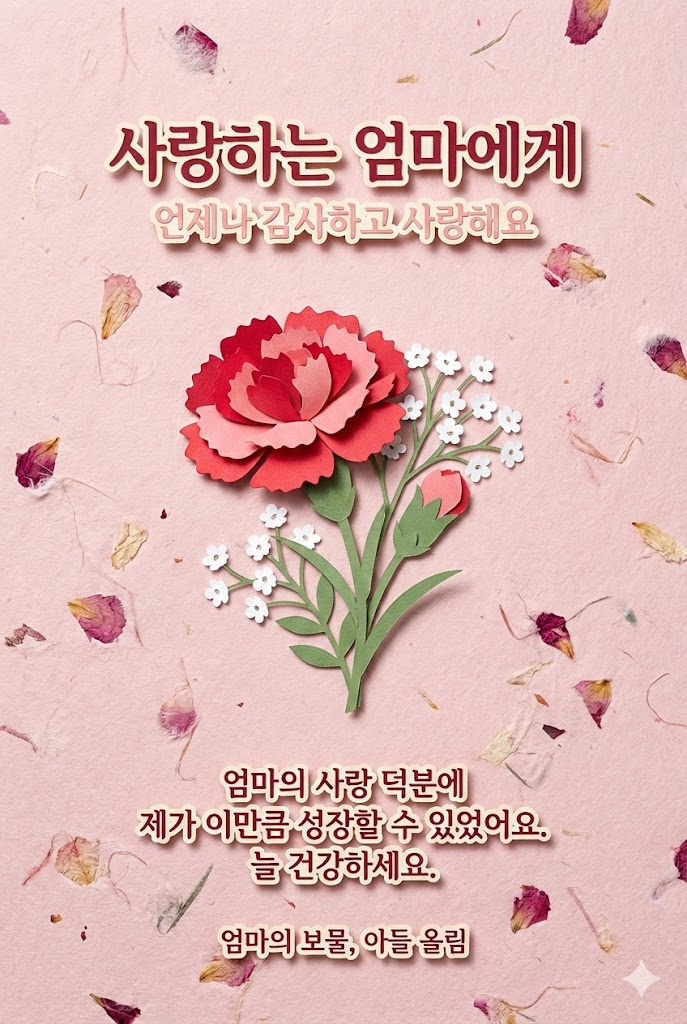 Design a premium and minimalist digital card with a "Handmade Paper-cut & Die-cut" aesthetic, inspired by the style of layered paper art. The image must be a direct, flat view of the card design itself, with absolutely no surrounding background context or environment. Full-bleed edge-to-edge digital graphic card illustration. No borders, no margins, no external background. The overall mood is sophisticated, clean, and artistic, combining a warm handmade feel with modern editorial design. Card Surface & Texture (All text elements must also be rendered in the same layered handmade paper-cut and die-cut style, appearing as intricately cut paper pieces layered onto the card surface, complete with subtle drop shadows to show depth.): Card Surface: The card itself has a soft pink handmade paper with visible flower petals. Header: At the top center, place a clean title: 사랑하는 엄마에게. Below it, add a small, sophisticated subtitle: 언제나 감사하고 사랑해요. Central Illustration: A detailed layered paper-cut style illustration depicted flat on the card. The piece should be a large, vibrant red carnation and small baby's breath flowers, rendered with simple geometric shapes and layers of red, pink, and green paper. Use a sophisticated color palette, combining vibrant tones with soft pastels to create a 3D relief effect with subtle shadows between layers. Keep the composition airy and minimalist. Message Body: In the lower center, include a heartfelt message: "엄마의 사랑 덕분에 제가 이만큼 성장할 수 있었어요. 늘 건강하세요.". Footer: At the very bottom, add the sender's name or brand name in a subtle signature style: "엄마의 보물, 아들 올림". Style Notes: Flat lay design, isolated card view, layered paper-cut art, die-cut shapes, vibrant yet refined colors, visible paper depth, clean margins, artistic composition. --ar 2:3