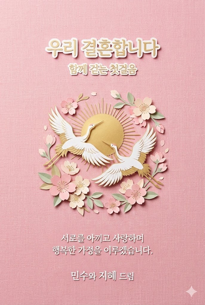 Design a premium and minimalist digital card with a "Handmade Paper-cut & Die-cut" aesthetic, inspired by the style of layered paper art. The image must be a direct, flat view of the card design itself, with absolutely no surrounding background context or environment. Full-bleed edge-to-edge digital graphic card illustration. No borders, no margins, no external background. The overall mood is sophisticated, clean, and artistic, combining a warm handmade feel with modern editorial design. Card Surface & Texture (All text elements must also be rendered in the same layered handmade paper-cut and die-cut style, appearing as intricately cut paper pieces layered onto the card surface, complete with subtle drop shadows to show depth.): Card Surface: The card itself has a luxurious pink linen paper texture. Header: At the top center, place a clean title: 우리 결혼합니다. Below it, add a small, sophisticated subtitle: 함께 걷는 첫걸음. Central Illustration: A detailed layered paper-cut style illustration depicted flat on the card. The piece should be two white cranes flying together towards a golden sun, surrounded by delicate cherry blossoms, rendered with simple geometric shapes and elegant paper layers. Use a sophisticated color palette, combining vibrant tones with soft pastels to create a 3D relief effect with subtle shadows between layers. Keep the composition airy and minimalist. Message Body: In the lower center, include a heartfelt message: "서로를 아끼고 사랑하며 행복한 가정을 이루겠습니다.". Footer: At the very bottom, add the sender's name or brand name in a subtle signature style: "민수와 지혜 드림". Style Notes: Flat lay design, isolated card view, layered paper-cut art, die-cut shapes, vibrant yet refined colors, visible paper depth, clean margins, artistic composition. --ar 2:3