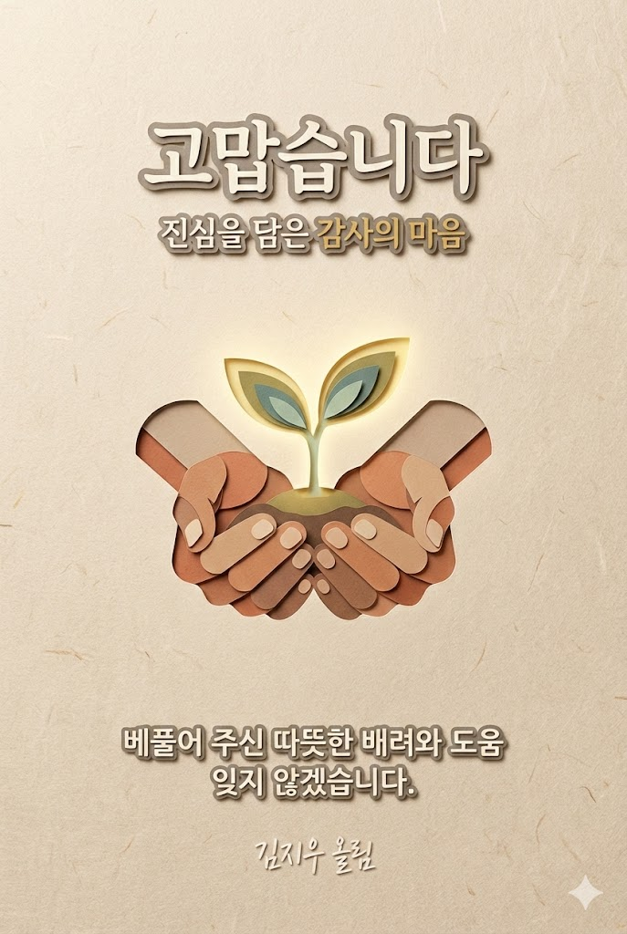 Design a premium and minimalist digital card with a "Handmade Paper-cut & Die-cut" aesthetic, inspired by the style of layered paper art. The image must be a direct, flat view of the card design itself, with absolutely no surrounding background context or environment. Full-bleed edge-to-edge digital graphic card illustration. No borders, no margins, no external background. The overall mood is sophisticated, clean, and artistic, combining a warm handmade feel with modern editorial design. Card Surface & Texture (All text elements must also be rendered in the same layered handmade paper-cut and die-cut style, appearing as intricately cut paper pieces layered onto the card surface, complete with subtle drop shadows to show depth.): Card Surface: The card itself has a warm beige Japanese Washi paper texture. Header: At the top center, place a clean title: 고맙습니다. Below it, add a small, sophisticated subtitle: 진심을 담은 감사의 마음. Central Illustration: A detailed layered paper-cut style illustration depicted flat on the card. The piece should be two hands holding a small, glowing seedling, rendered with simple geometric shapes and earthy paper layers in terracotta and olive green. Use a sophisticated color palette, combining vibrant tones with soft pastels to create a 3D relief effect with subtle shadows between layers. Keep the composition airy and minimalist. Message Body: In the lower center, include a heartfelt message: "베풀어 주신 따뜻한 배려와 도움 잊지 않겠습니다.". Footer: At the very bottom, add the sender's name or brand name in a subtle signature style: "김지우 올림". Style Notes: Flat lay design, isolated card view, layered paper-cut art, die-cut shapes, vibrant yet refined colors, visible paper depth, clean margins, artistic composition. --ar 2:3