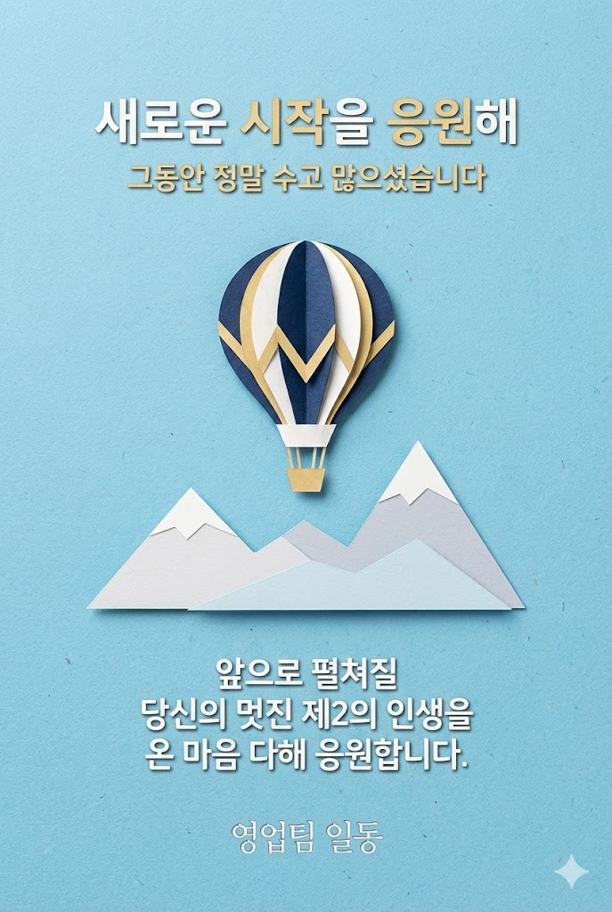 Design a premium and minimalist digital card with a "Handmade Paper-cut & Die-cut" aesthetic, inspired by the style of layered paper art. The image must be a direct, flat view of the card design itself, with absolutely no surrounding background context or environment. Full-bleed edge-to-edge digital graphic card illustration. No borders, no margins, no external background. The overall mood is sophisticated, clean, and artistic, combining a warm handmade feel with modern editorial design. Card Surface & Texture (All text elements must also be rendered in the same layered handmade paper-cut and die-cut style, appearing as intricately cut paper pieces layered onto the card surface, complete with subtle drop shadows to show depth.): Card Surface: The card itself has a sky blue recycled paper with natural fibers. Header: At the top center, place a clean title: 새로운 시작을 응원해. Below it, add a small, sophisticated subtitle: 그동안 정말 수고 많으셨습니다. Central Illustration: A detailed layered paper-cut style illustration depicted flat on the card. The piece should be a hot air balloon rising above soft mountains, rendered with simple geometric shapes and vibrant paper layers in navy, white, and gold. Use a sophisticated color palette, combining vibrant tones with soft pastels to create a 3D relief effect with subtle shadows between layers. Keep the composition airy and minimalist. Message Body: In the lower center, include a heartfelt message: "앞으로 펼쳐질 당신의 멋진 제2의 인생을 온 마음 다해 응원합니다.". Footer: At the very bottom, add the sender's name or brand name in a subtle signature style: "영업팀 일동". Style Notes: Flat lay design, isolated card view, layered paper-cut art, die-cut shapes, vibrant yet refined colors, visible paper depth, clean margins, artistic composition. --ar 2:3
