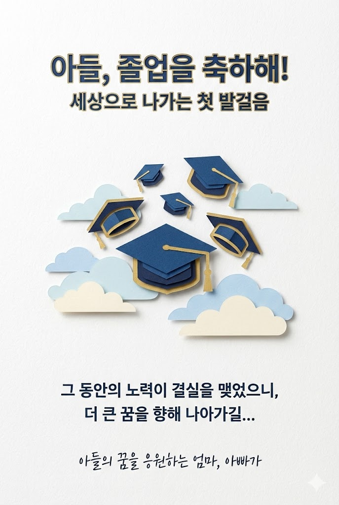 Design a premium and minimalist digital card with a "Handmade Paper-cut & Die-cut" aesthetic, inspired by the style of layered paper art. The image must be a direct, flat view of the card design itself, with absolutely no surrounding background context or environment. Full-bleed edge-to-edge digital graphic card illustration. No borders, no margins, no external background. The overall mood is sophisticated, clean, and artistic, combining a warm handmade feel with modern editorial design. Card Surface & Texture (All text elements must also be rendered in the same layered handmade paper-cut and die-cut style, appearing as intricately cut paper pieces layered onto the card surface, complete with subtle drop shadows to show depth.): Card Surface: The card itself has a crisp white cardstock with a light pebble texture. Header: At the top center, place a clean title: 아들, 졸업을 축하해! Below it, add a small, sophisticated subtitle: 세상으로 나가는 첫 발걸음. Central Illustration: A detailed layered paper-cut style illustration depicted flat on the card. The piece should be a group of graduation caps flying high in the air, rendered with simple geometric shapes and layers of dark blue and gold paper. Use a sophisticated color palette, combining vibrant tones with soft pastels to create a 3D relief effect with subtle shadows between layers. Keep the composition airy and minimalist. Message Body: In the lower center, include a heartfelt message: "그 동안의 노력이 결실을 맺었으니, 더 큰 꿈을 향해 나아가길...". Footer: At the very bottom, add the sender's name or brand name in a subtle signature style: "아들의 꿈을 응원하는 엄마, 아빠가". Style Notes: Flat lay design, isolated card view, layered paper-cut art, die-cut shapes, vibrant yet refined colors, visible paper depth, clean margins, artistic composition. --ar 2:3