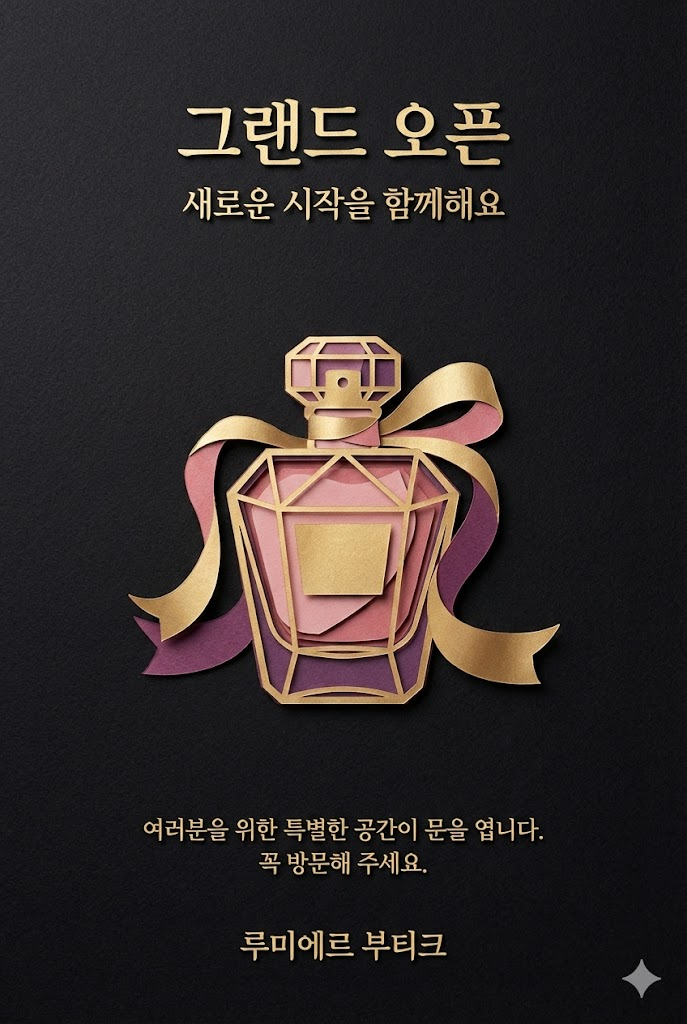 Design a premium and minimalist digital card with a "Handmade Paper-cut & Die-cut" aesthetic, inspired by the style of layered paper art. The image must be a direct, flat view of the card design itself, with absolutely no surrounding background context or environment. Full-bleed edge-to-edge digital graphic card illustration. No borders, no margins, no external background. The overall mood is sophisticated, clean, and artistic, combining a warm handmade feel with modern editorial design. Card Surface & Texture (All text elements must also be rendered in the same layered handmade paper-cut and die-cut style, appearing as intricately cut paper pieces layered onto the card surface, complete with subtle drop shadows to show depth.): Card Surface: The card itself has a sophisticated black paper texture. Header: At the top center, place a clean title: 그랜드 오픈. Below it, add a small, sophisticated subtitle: 새로운 시작을 함께해요. Central Illustration: A detailed layered paper-cut style illustration depicted flat on the card. The piece should be a stylish perfume bottle and silk ribbons, rendered with simple geometric shapes and vibrant paper layers in gold, rose pink, and deep purple. Use a sophisticated color palette, combining vibrant tones with soft pastels to create a 3D relief effect with subtle shadows between layers. Keep the composition airy and minimalist. Message Body: In the lower center, include a heartfelt message: "여러분을 위한 특별한 공간이 문을 엽니다. 꼭 방문해 주세요.". Footer: At the very bottom, add the sender's name or brand name in a subtle signature style: "루미에르 부티크". Style Notes: Flat lay design, isolated card view, layered paper-cut art, die-cut shapes, vibrant yet refined colors, visible paper depth, clean margins, artistic composition. --ar 2:3