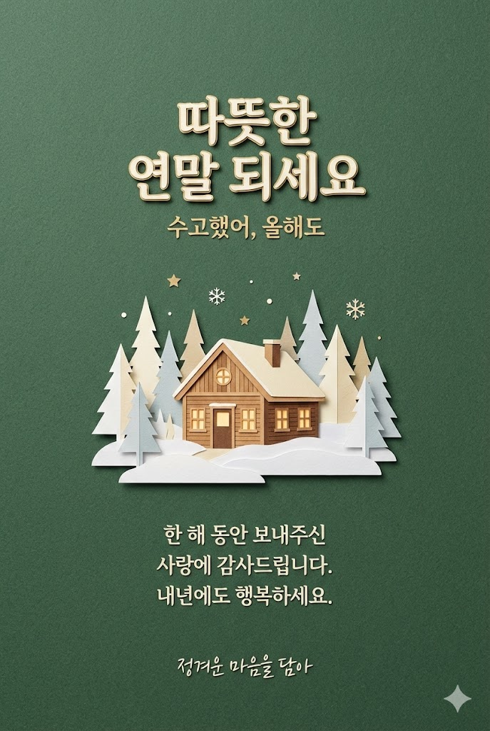 Design a premium and minimalist digital card with a "Handmade Paper-cut & Die-cut" aesthetic, inspired by the style of layered paper art. The image must be a direct, flat view of the card design itself, with absolutely no surrounding background context or environment. Full-bleed edge-to-edge digital graphic card illustration. No borders, no margins, no external background. The overall mood is sophisticated, clean, and artistic, combining a warm handmade feel with modern editorial design. Card Surface & Texture (All text elements must also be rendered in the same layered handmade paper-cut and die-cut style, appearing as intricately cut paper pieces layered onto the card surface, complete with subtle drop shadows to show depth.): Card Surface: The card itself has a thick, dark green paper with visible natural fibers. Header: At the top center, place a clean title: 따뜻한 연말 되세요. Below it, add a small, sophisticated subtitle: 수고했어, 올해도. Central Illustration: A detailed layered paper-cut style illustration depicted flat on the card. The piece should be a cozy wooden house with light shining from windows in a snowy forest, rendered with simple geometric shapes and layers of white, brown, and warm yellow paper. Use a sophisticated color palette, combining vibrant tones with soft pastels to create a 3D relief effect with subtle shadows between layers. Keep the composition airy and minimalist. Message Body: In the lower center, include a heartfelt message: "한 해 동안 보내주신 사랑에 감사드립니다. 내년에도 행복하세요.". Footer: At the very bottom, add the sender's name or brand name in a subtle signature style: "정겨운 마음을 담아". Style Notes: Flat lay design, isolated card view, layered paper-cut art, die-cut shapes, vibrant yet refined colors, visible paper depth, clean margins, artistic composition. --ar 2:3