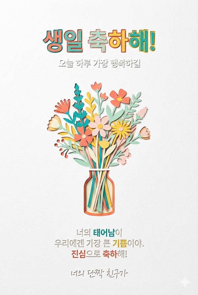 Design a premium and minimalist digital card with a "Handmade Paper-cut & Die-cut" aesthetic, inspired by the style of layered paper art. The image must be a direct, flat view of the card design itself, with absolutely no surrounding background context or environment. Full-bleed edge-to-edge digital graphic card illustration. No borders, no margins, no external background. The overall mood is sophisticated, clean, and artistic, combining a warm handmade feel with modern editorial design. Card Surface & Texture (All text elements must also be rendered in the same layered handmade paper-cut and die-cut style, appearing as intricately cut paper pieces layered onto the card surface, complete with subtle drop shadows to show depth.): Card Surface: The card itself has a bright white textured artisanal paper. Header: At the top center, place a clean title: 생일 축하해!. Below it, add a small, sophisticated subtitle: 오늘 하루 가장 행복하길. Central Illustration: A detailed layered paper-cut style illustration depicted flat on the card. The piece should be a giant colorful bouquet of wild flowers in a vase, rendered with simple geometric shapes and vibrant paper layers in coral, teal, and sunny yellow. Use a sophisticated color palette, combining vibrant tones with soft pastels to create a 3D relief effect with subtle shadows between layers. Keep the composition airy and minimalist. Message Body: In the lower center, include a heartfelt message: "너의 태어남이 우리에겐 가장 큰 기쁨이야. 진심으로 축하해!". Footer: At the very bottom, add the sender's name or brand name in a subtle signature style: "너의 단짝 친구가". Style Notes: Flat lay design, isolated card view, layered paper-cut art, die-cut shapes, vibrant yet refined colors, visible paper depth, clean margins, artistic composition. --ar 2:3