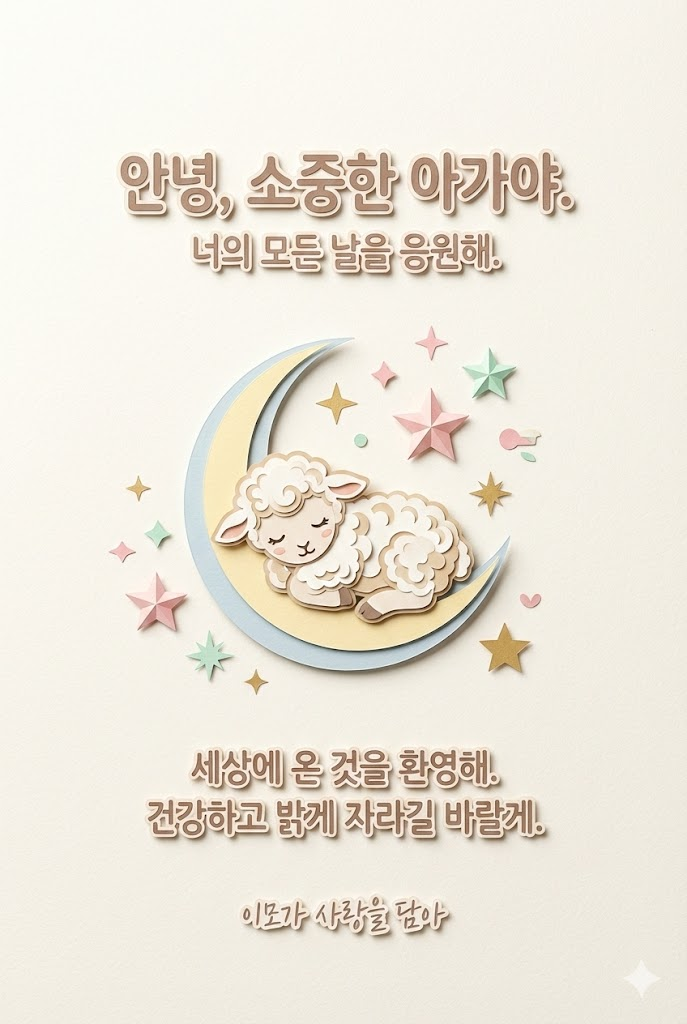 Design a premium and minimalist digital card with a "Handmade Paper-cut & Die-cut" aesthetic, inspired by the style of layered paper art. The image must be a direct, flat view of the card design itself, with absolutely no surrounding background context or environment. Full-bleed edge-to-edge digital graphic card illustration. No borders, no margins, no external background. The overall mood is sophisticated, clean, and artistic, combining a warm handmade feel with modern editorial design. Card Surface & Texture (All text elements must also be rendered in the same layered handmade paper-cut and die-cut style, appearing as intricately cut paper pieces layered onto the card surface, complete with subtle drop shadows to show depth.): Card Surface: The card itself has a soft, cream-colored cotton paper. Header: At the top center, place a clean title: 안녕, 소중한 아가야. Below it, add a small, sophisticated subtitle: 너의 모든 날을 응원해. Central Illustration: A detailed layered paper-cut style illustration depicted flat on the card. The piece should be a cute baby lamb sleeping on a crescent moon with floating stars, rendered with simple geometric shapes and soft pastel paper layers. Use a sophisticated color palette, combining vibrant tones with soft pastels to create a 3D relief effect with subtle shadows between layers. Keep the composition airy and minimalist. Message Body: In the lower center, include a heartfelt message: "세상에 온 것을 환영해. 건강하고 밝게 자라길 바랄게.". Footer: At the very bottom, add the sender's name or brand name in a subtle signature style: "이모가 사랑을 담아". Style Notes: Flat lay design, isolated card view, layered paper-cut art, die-cut shapes, vibrant yet refined colors, visible paper depth, clean margins, artistic composition. --ar 2:3