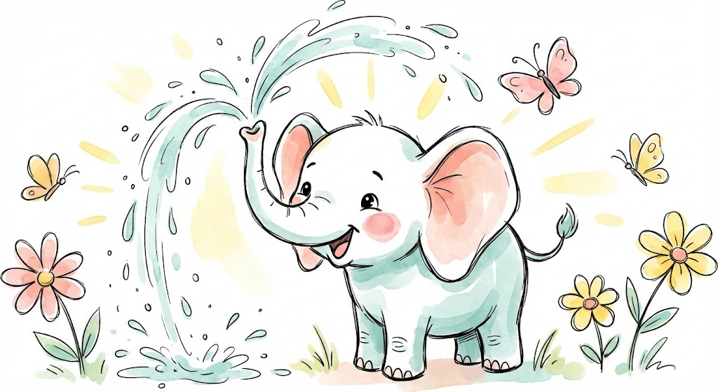 A cute and whimsical watercolor doodle of [a happy baby elephant spraying water with its trunk]. The style is hand-drawn with loose, sketchy ink outlines and soft, washed-out pastel colors like warm pink, sunny yellow, and light teal. The subject should be simple, charming, and centered on a clean white background. It resembles a sweet children's book illustration or a playful sticker design. High quality, artistic, minimal texture, isolated on white.