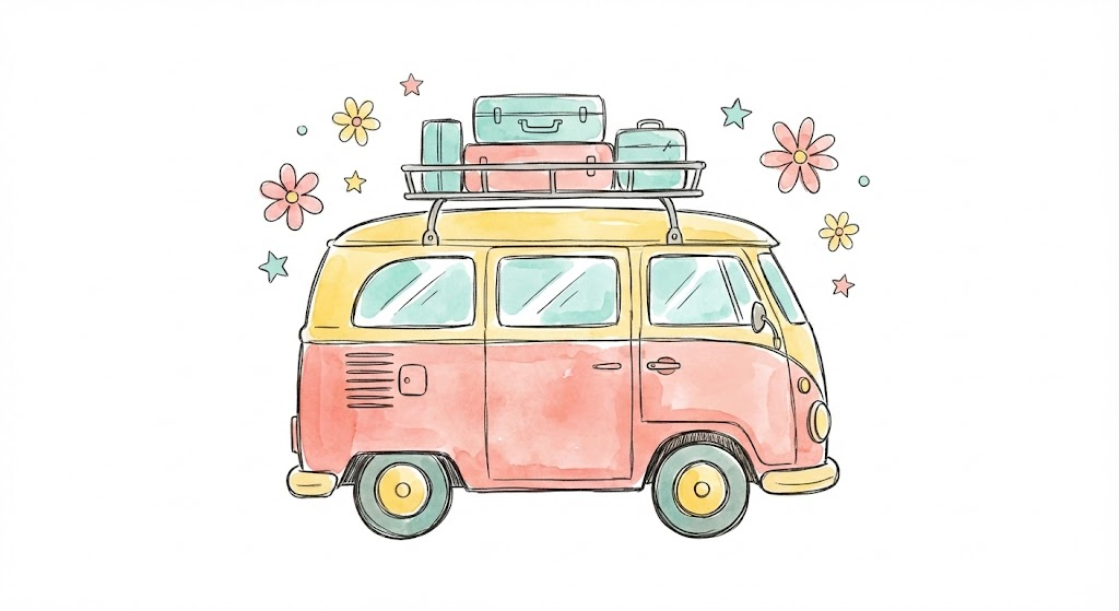 A cute and whimsical watercolor doodle of [a rounded retro mini van with luggage on the roof]. The style is hand-drawn with loose, sketchy ink outlines and soft, washed-out pastel colors like warm pink, sunny yellow, and light teal. The subject should be simple, charming, and centered on a clean white background. It resembles a sweet children's book illustration or a playful sticker design. High quality, artistic, minimal texture, isolated on white.