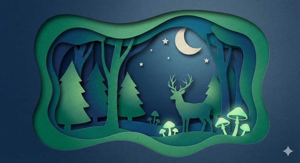 A digital paper cut-out illustration of a mysterious forest with glowing mushrooms and a deer. The image is composed of layered organic shapes with subtle drop shadows to create depth and dimension. The texture resembles high-quality craft paper. The color scheme uses soft gradients of midnight blue and emerald green, giving a serene and dreamlike quality. No outlines, focus on silhouette and depth.