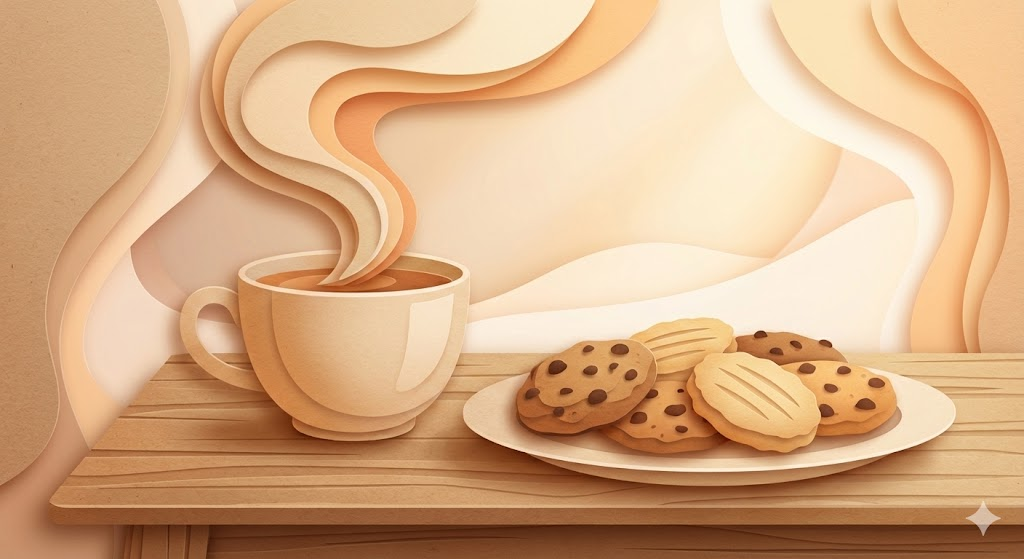 A digital paper cut-out illustration of a steaming cup of tea and a plate of cookies on a wooden table. The image is composed of layered organic shapes with subtle drop shadows to create depth and dimension. The texture resembles high-quality craft paper. The color scheme uses soft gradients of warm beige, caramel, and soft orange, giving a serene and dreamlike quality. No outlines, focus on silhouette and depth.