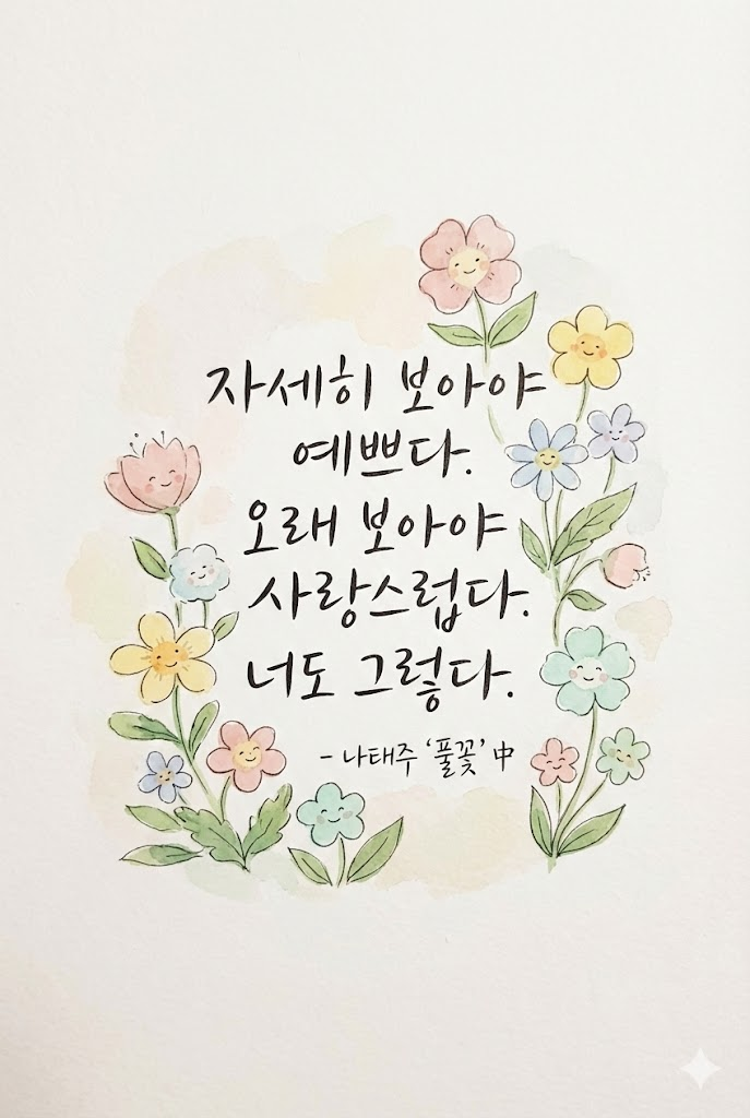 A hand-drawn illustration on lightly textured off-white paper, combining soft watercolor and delicate black dip-pen ink lines. The style is cozy, childlike, and dreamy with muted pastel colors. The central composition features " [자세히 보아야 예쁘다. 오래 보아야 사랑스럽다. 너도 그렇다. - 나태주 '풀꽃' 中"], written in neat, elegant dip-pen calligraphyalongside [small, smiling wild flowers and green leaves subtly growing around and intertwining with the handwritten text]. Plenty of empty paper space, minimal background. --ar 2:3