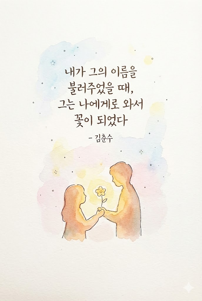 A hand-drawn illustration on lightly textured off-white paper, combining soft watercolor and delicate black dip-pen ink lines. The style is cozy, childlike, and dreamy with muted pastel colors. The central composition features ["내가 그의 이름을 불러주었을 때, 그는 나에게로 와서 꽃이 되었다 - 김춘수"] written in neat, elegant dip-pen calligraphy alongside [a charming, simple watercolor illustration of warm silhouettes of two people facing each other with a single glowing flower]. Plenty of empty paper space, minimal background. --ar 2:3