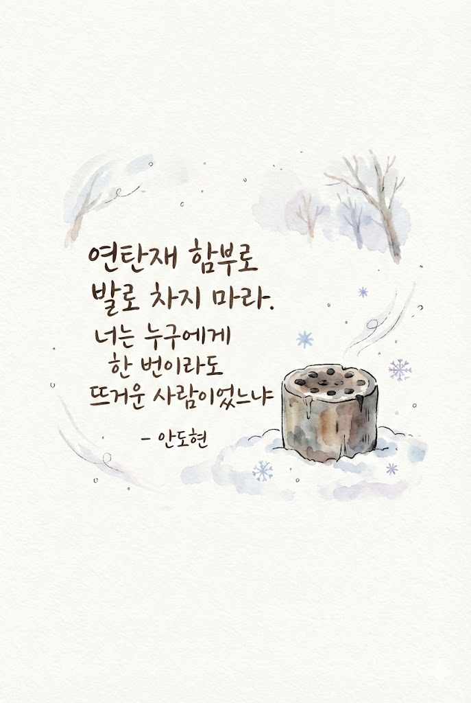 A hand-drawn illustration on lightly textured off-white paper, combining soft watercolor and delicate black dip-pen ink lines. The style is cozy, childlike, and dreamy with muted pastel colors. The central composition features ["연탄재 함부로 발로 차지 마라. 너는 누구에게 한 번이라도 뜨거운 사람이었느냐 - 안도현"] written in neat, elegant dip-pen calligraphy alongside [a charming, simple watercolor illustration of a single burnt-out charcoal briquette on a white snowy street]. Plenty of empty paper space, minimal background. --ar 2:3