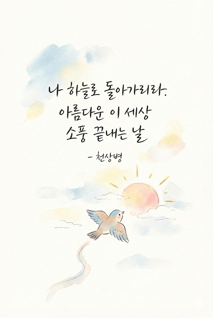 A hand-drawn illustration on lightly textured off-white paper, combining soft watercolor and delicate black dip-pen ink lines. The style is cozy, childlike, and dreamy with muted pastel colors. The central composition features ["나 하늘로 돌아가리라. 아름다운 이 세상 소풍 끝내는 날 - 천상병"] written in neat, elegant dip-pen calligraphy alongside [a charming, simple watercolor illustration of a small bird flying towards the soft morning sun]. Plenty of empty paper space, minimal background. --ar 2:3
