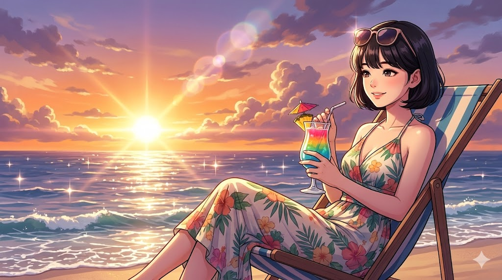 (Masterpiece, Best Quality, High Resolution), 2D anime style, cel shading, vivid colors, detailed illustration. A beautiful [Korean girl] with [short bob hair and fair skin]. She is wearing [a flowy tropical sundress and sunglasses on her head]. She is sitting comfortably on a beach chair, [holding a tropical drink], with a [relaxed and peaceful expression]. Background:[sunset over the Mediterranean sea, golden hour lighting, orange and purple sky], sparkling ocean waves, lens flare, cumulus clouds in the blue sky, cinematic lighting, detailed water texture. Tech: 4k, 8k, ultra-detailed, 16:9 aspect ratio. Negative: low quality, worst quality, ugly, bad anatomy, watermark, text, subtitles, crowd, other people.