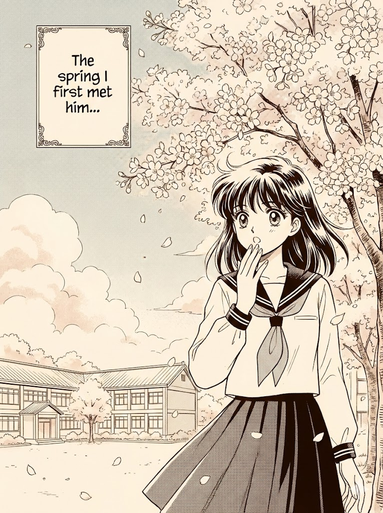 A single comic book panel in a classic 90s Japanese manga style. In the foreground, a high school girl standing under a blooming cherry blossom tree, looking surprised. In the background, a peaceful school courtyard with soft clouds. The panel has a caption box with the text "The spring I first met him...". The lighting creates a nostalgic and romantic mood. --ar 3:4