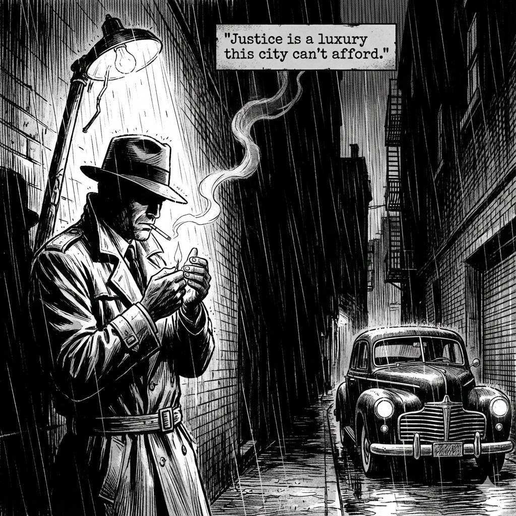 A single comic book panel in a dark noir detective comic style. In the foreground, a detective in a trench coat lighting a cigarette under a streetlamp. In the background, a rainy alleyway with deep shadows and a parked vintage car. The panel has a caption box with the text "Justice is a luxury this city can't afford.". The lighting creates a mysterious and gritty mood. --ar 1:1