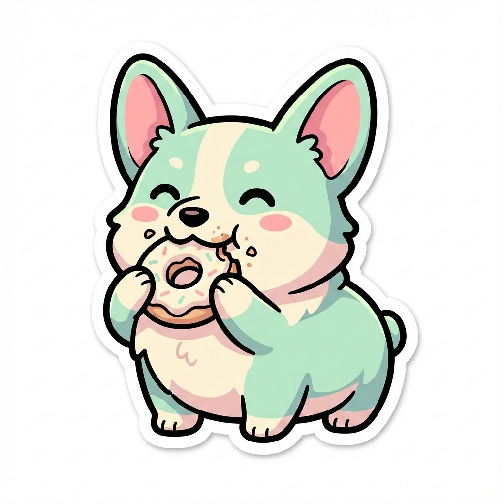 A die-cut vinyl sticker design in cute kawaii of a chubby Corgi dog. Key features include eating a donut with a happy expression, crumbs on face using a pastel pink, cream, and mint color palette. The illustration has thick, soft black outlines and simple flat cel-shading. White border around the edge, smooth vector finish, high quality, isolated on solid white background. --ar 1:1