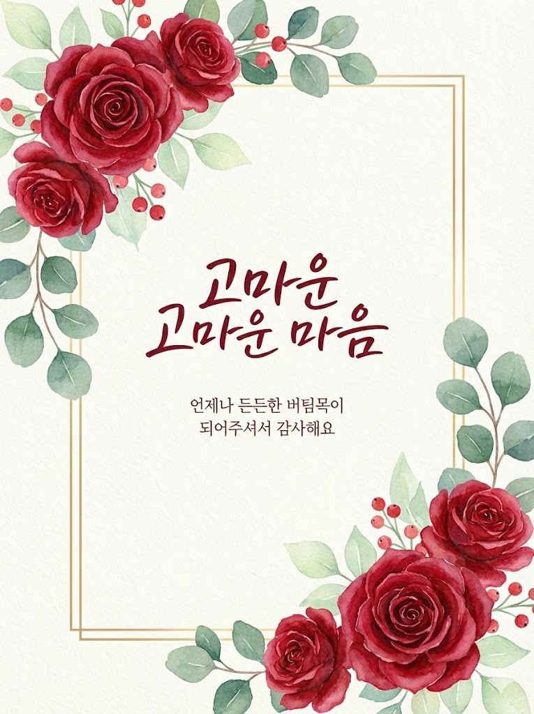 Full-bleed edge-to-edge digital graphic card illustration. No borders, no margins, no external background. A high-quality hand-painted watercolor card design on textured paper. The composition includes vibrant floral arrangements at the top-left and bottom-right corners, featuring 진한 붉은 장미와 유칼립투스 가지 with soft green leaves and small berries. An expanded thin, minimalist rectangular frame is centered with very narrow outer margins, its top-left and bottom-right corners precisely positioned at the mid-points of the top and bottom floral clusters, partially obscured and hidden behind the overlapping elements to create a layered, 3D effect. In the center, there is elegant typography for "고마운 마음" followed by smaller, minimalist text for "언제나 든든한 버팀목이 되어주셔서 감사해요". The overall aesthetic is elegant, fresh, and organic. --ar 3:4