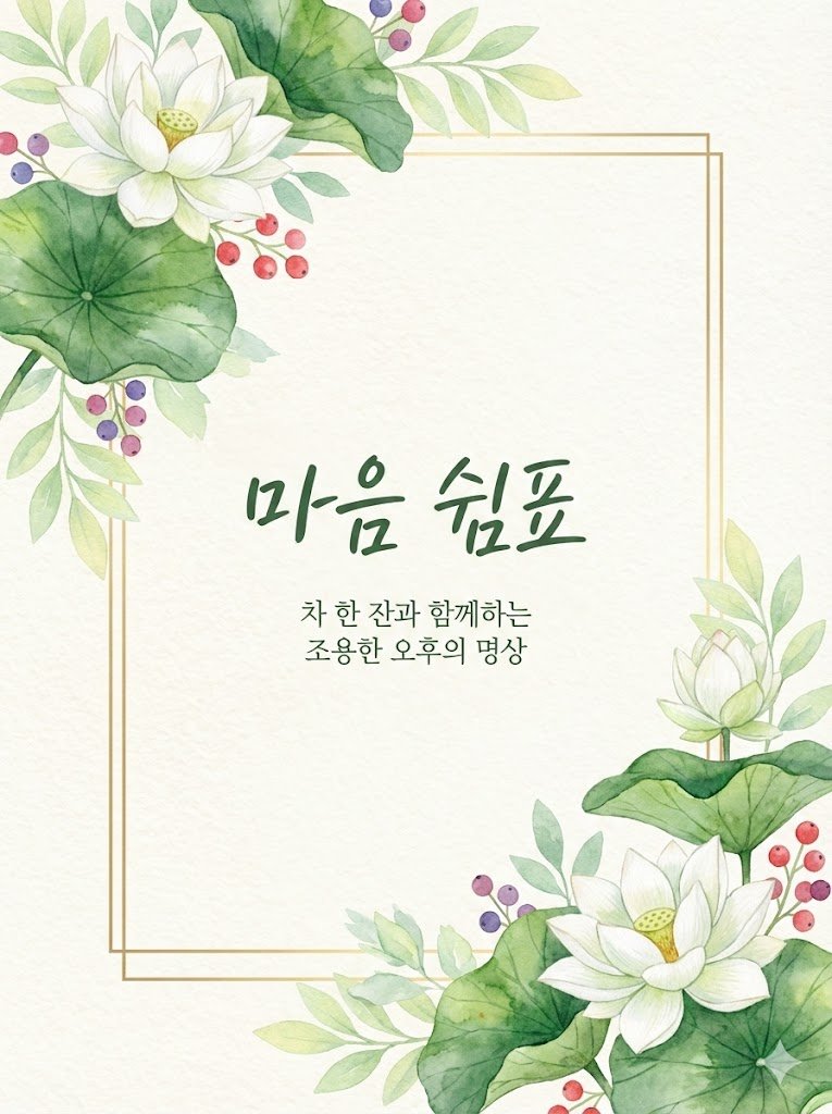 Full-bleed edge-to-edge digital graphic card illustration. No borders, no margins, no external background. A high-quality hand-painted watercolor card design on textured paper. The composition includes vibrant floral arrangements at the top-left and bottom-right corners, featuring 단아한 백연꽃과 커다란 연잎 with soft green leaves,  and small berries. An expanded thin, minimalist rectangular frame is centered with very narrow outer margins, its top-left and bottom-right corners precisely positioned at the mid-points of the top and bottom floral clusters, partially obscured and hidden behind the overlapping elements to create a layered, 3D effect. In the center, there is elegant typography for "마음 쉼표" followed by smaller, minimalist text for "차 한 잔과 함께하는 조용한 오후의 명상". The overall aesthetic is elegant, fresh, and organic. --ar 3:4