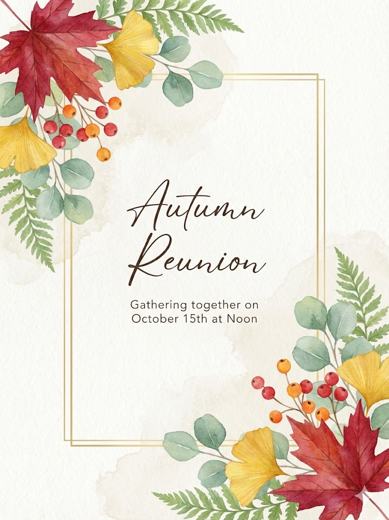 Full-bleed edge-to-edge digital graphic card illustration. No borders, no margins, no external background. A high-quality hand-painted watercolor card design on textured paper. The composition includes vibrant floral arrangements at the top-left and bottom-right corners, featuring deep red maple leaves and golden ginkgo with soft green leaves  and small berries. An expanded thin, minimalist rectangular frame is centered with very narrow outer margins, its top-left and bottom-right corners precisely positioned at the mid-points of the top and bottom floral clusters, partially obscured and hidden behind the overlapping elements to create a layered, 3D effect. In the center, there is elegant typography for "Autumn Reunion" followed by smaller, minimalist text for "Gathering together on October 15th at Noon". The overall aesthetic is elegant, fresh, and organic. --ar 3:4