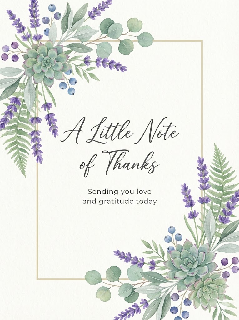 Full-bleed edge-to-edge digital graphic card illustration. No borders, no margins, no external background. A high-quality hand-painted watercolor card design on textured paper. The composition includes vibrant floral arrangements at the top-left and bottom-right corners, featuring purple lavender and silver-green sage leaves with soft green leaves, succulents, and small berries. An expanded thin, minimalist rectangular frame is centered with very narrow outer margins, its top-left and bottom-right corners precisely positioned at the mid-points of the top and bottom floral clusters, partially obscured and hidden behind the overlapping elements to create a layered, 3D effect. In the center, there is elegant typography for "A Little Note of Thanks" followed by smaller, minimalist text for "Sending you love and gratitude today". The overall aesthetic is elegant, fresh, and organic. --ar 3:4