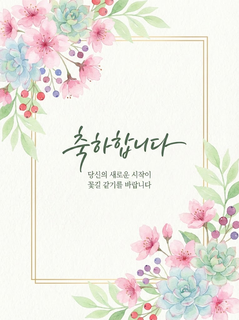 Full-bleed edge-to-edge digital graphic card illustration. No borders, no margins, no external background. A high-quality hand-painted watercolor card design on textured paper. The composition includes vibrant floral arrangements at the top-left and bottom-right corners, featuring 흩날리는 분홍 벚꽃과 연녹색 잎사귀 with soft green leaves, succulents, and small berries. An expanded thin, minimalist rectangular frame is centered with very narrow outer margins, its top-left and bottom-right corners precisely positioned at the mid-points of the top and bottom floral clusters, partially obscured and hidden behind the overlapping elements to create a layered, 3D effect. In the center, there is elegant typography for "축하합니다" followed by smaller, minimalist text for "당신의 새로운 시작이 꽃길 같기를 바랍니다". The overall aesthetic is elegant, fresh, and organic. --ar 3:4