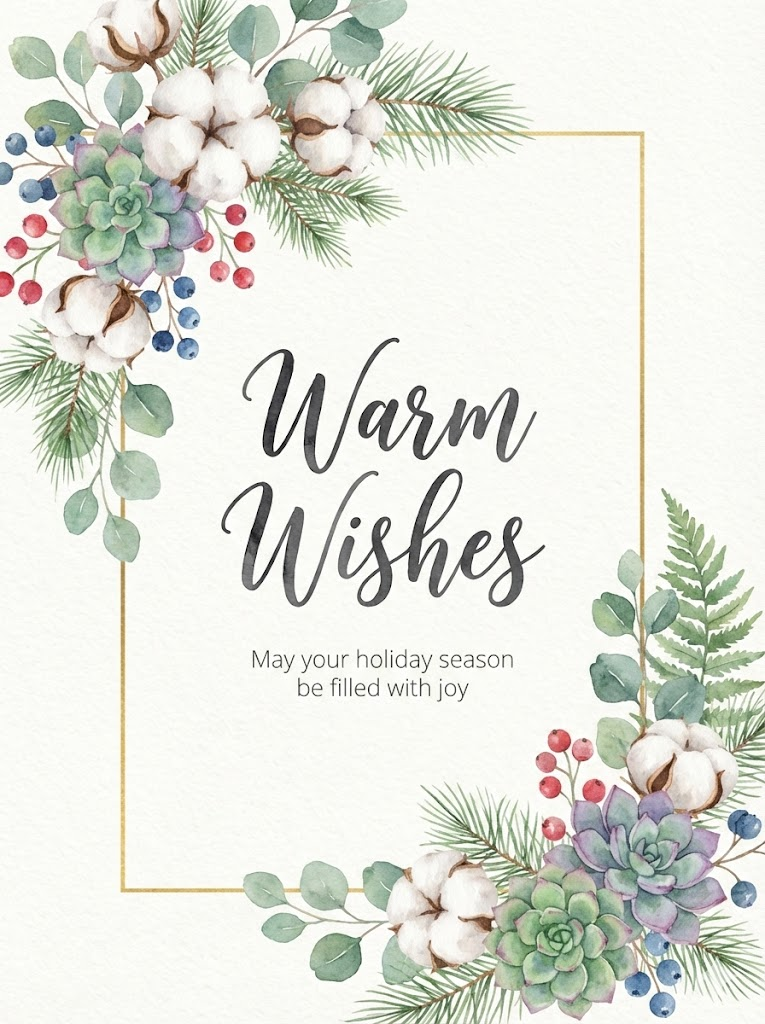 Full-bleed edge-to-edge digital graphic card illustration. No borders, no margins, no external background. A high-quality hand-painted watercolor card design on textured paper. The composition includes vibrant floral arrangements at the top-left and bottom-right corners, featuring soft cotton flowers and pine needles with soft green leaves, succulents, and small berries. An expanded thin, minimalist rectangular frame is centered with very narrow outer margins, its top-left and bottom-right corners precisely positioned at the mid-points of the top and bottom floral clusters, partially obscured and hidden behind the overlapping elements to create a layered, 3D effect. In the center, there is elegant typography for "Warm Wishes" followed by smaller, minimalist text for "May your holiday season be filled with joy". The overall aesthetic is elegant, fresh, and organic. --ar 3:4