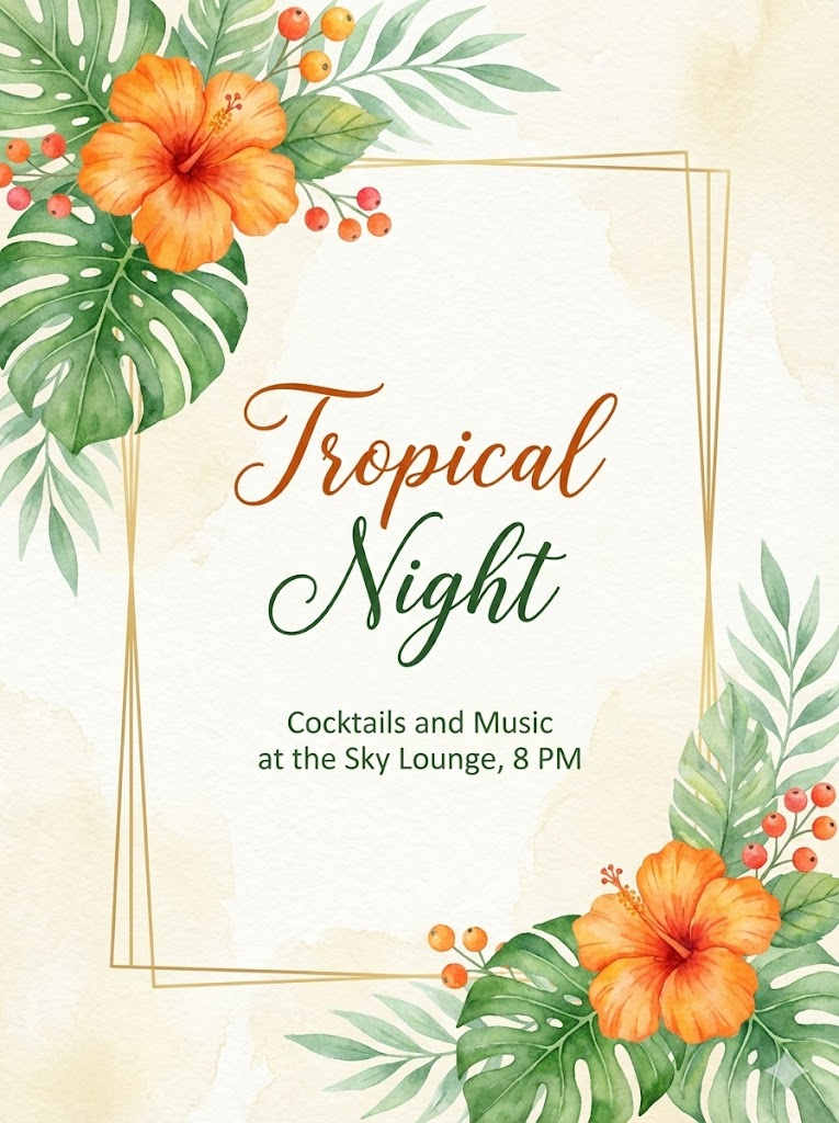 Full-bleed edge-to-edge digital graphic card illustration. No borders, no margins, no external background. A high-quality hand-painted watercolor card design on textured paper. The composition includes vibrant floral arrangements at the top-left and bottom-right corners, featuring orange hibiscus and lush monstera leaves with soft green leaves  and small berries. An expanded thin, minimalist rectangular frame is centered with very narrow outer margins, its top-left and bottom-right corners precisely positioned at the mid-points of the top and bottom floral clusters, partially obscured and hidden behind the overlapping elements to create a layered, 3D effect. In the center, there is elegant typography for "Tropical Night" followed by smaller, minimalist text for "Cocktails and Music at the Sky Lounge, 8 PM". The overall aesthetic is elegant, fresh, and organic. --ar 3:4