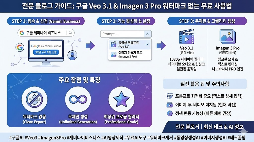 구글의 Veo 3.1과 Imagen 3 Pro는 창작자들에게 새로운 영감을 주는 강력한 도구입니다. 워터마크 없는 깔끔한 결과물을 통해 여러분의 상상력을 현실로 구현해 보세요!