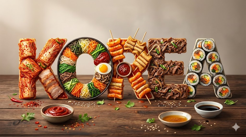 A high-quality digital illustration, food-photography-inspired. The word KOREA is spelled out in bold, sculptural, uppercase letters, with subtle overlapping and stacking for creating depth. The background is a rich, dark-toned surface complementing the food palette. Each letter is intricately filled and constructed with iconic traditional foods from KOREA, specifically featuring spicy kimchi, colorful bibimbap vegetables, tteokbokki rice cakes, savory bulgogi, and rolled kimbap slices, arranged to follow the typography contours. Small bowls of gochujang paste, sesame oil, and soy sauce and scattered raw ingredients are naturally integrated into the composition. The styling is art-directed, balanced, textured, and visually rich with gentle overlaps. Soft, diffused lighting enhances natural textures, creating a warm, appetizing, premium aesthetic. Ultra-detailed, clean composition, high contrast, refined visual storytelling. --ar 16:9