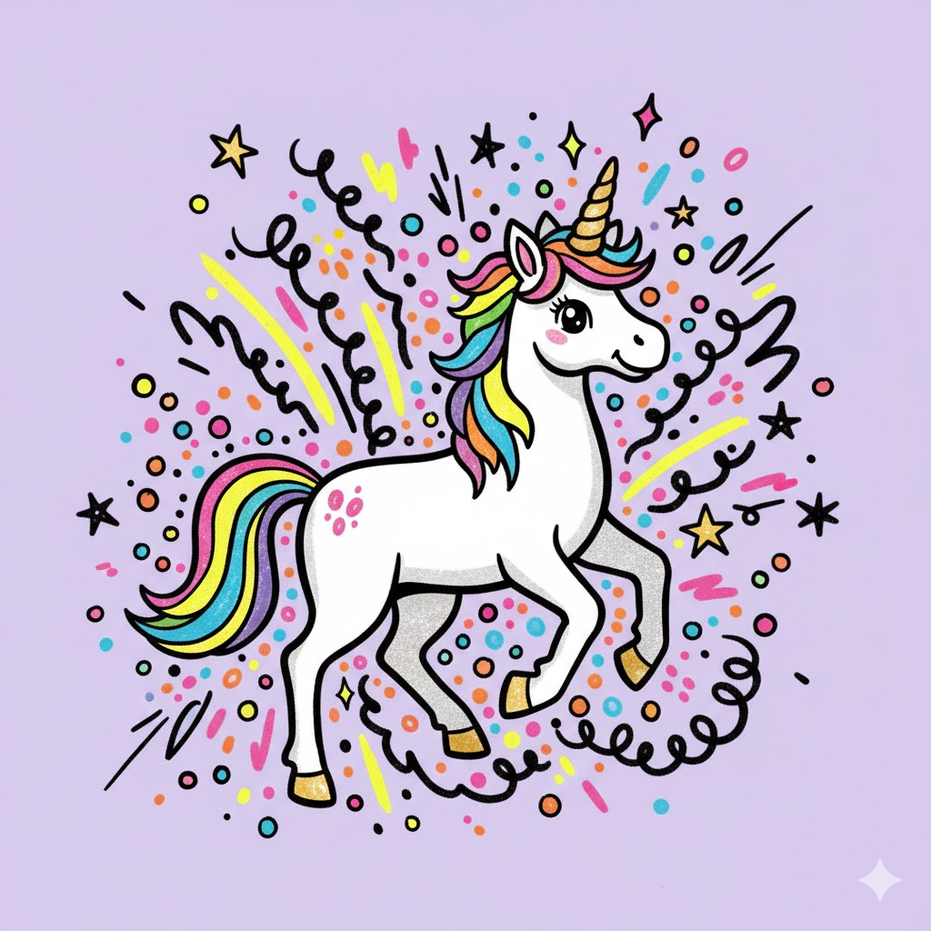 A joyful, hand-drawn style cartoon featuring a [magical unicorn] as the main subject, against a pale violet backdrop. The space around the subject is filled with black and neon yellow squiggles, tiny colorful circles, and small, energetic star shapes.