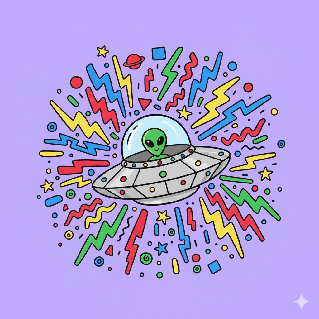 Cartoon illustration in a children's book style, featuring a [flying saucer] on a light purple field. The image is densely decorated with abstract, playful doodles in bright primary colors, including lightning bolts, squiggles, and various small shapes in a bold, fun outline style.
