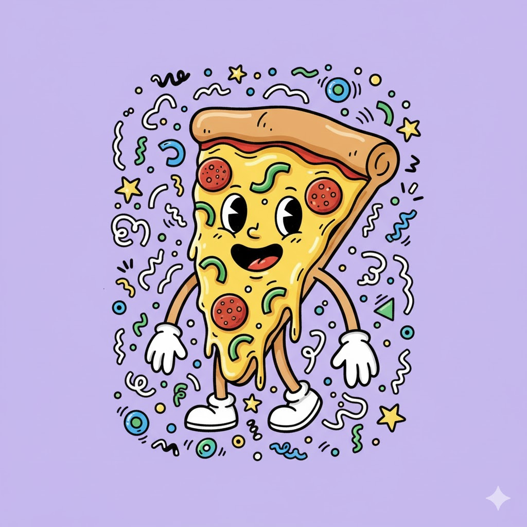 A playful, cartoonish style illustration of a [slice of pizza] with a friendly face, set against a light purple background. The image is decorated with black and white squiggly lines, yellow stars, and abstract blue and green geometric doodles.