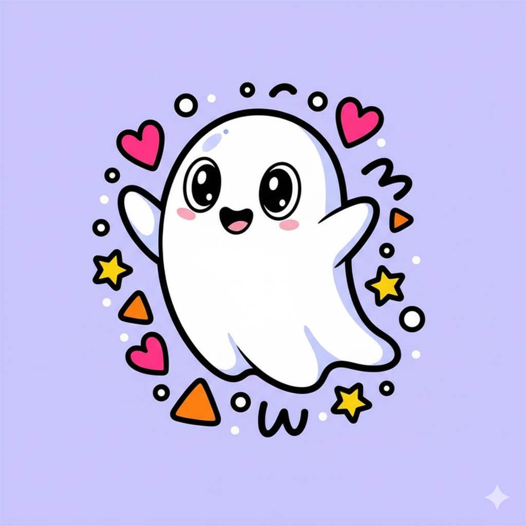 In a vibrant, sticker-like cartoon aesthetic, a central illustration of a [cute ghost] on a soft lavender background. Surrounding elements include whimsical abstract doodles like pink hearts, orange triangles, and white dots, giving it a fun, quirky vibe