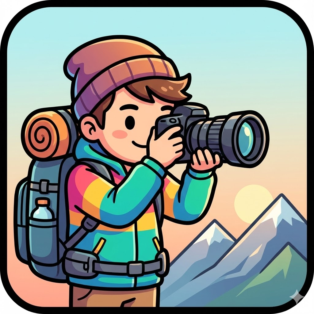 A cute, chibi-style cartoon illustration of a single character, rendered with thick black outlines and vibrant, cheerful flat colors. The character is [an adventurous man carrying a backpack, wearing a windbreaker, and holding a DSLR camera up to his eye to take a photo of a scenic view]. The entire illustration is contained within a rounded square frame with a soft, two-tone gradient background (e.g., light blue to warm peach). The style is playful, friendly, and clean, similar to a mobile app icon or sticker. --ar 1:1
