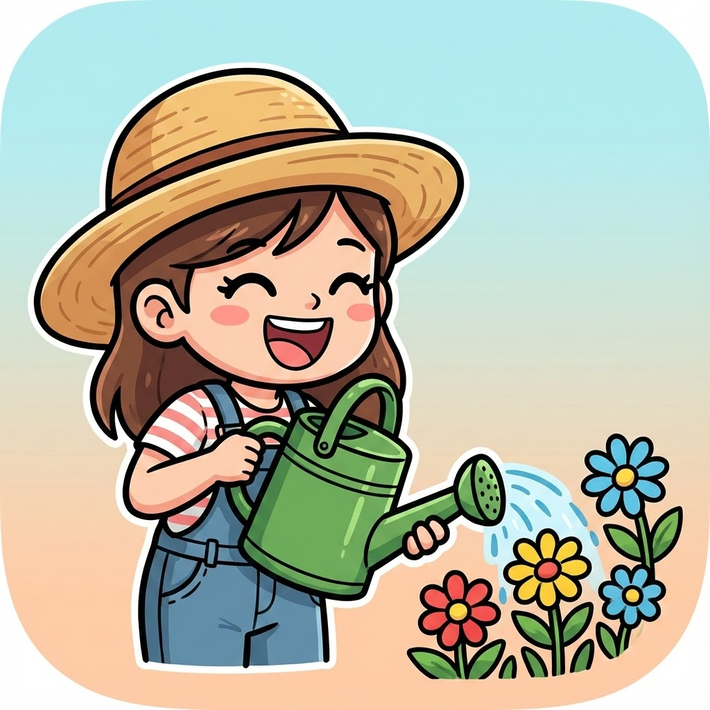 활짝 웃으며 밀짚모자를 쓰고 멜빵바지를 입은 여성이 물뿌리개로 꽃에 물을 주고 있는 모습을 상상하며 만들었습니다.