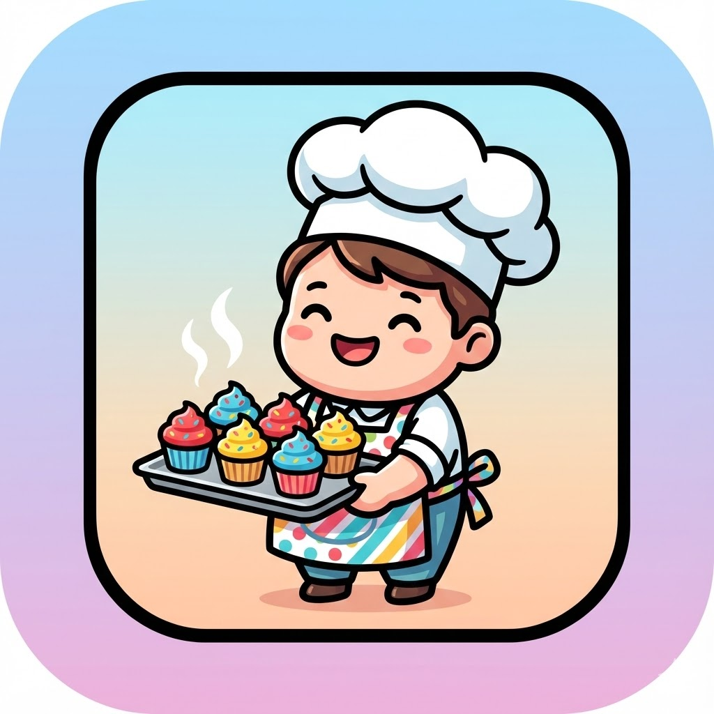 A cute, chibi-style cartoon illustration of a single character, rendered with thick black outlines and vibrant, cheerful flat colors. The character is [a smiling baker wearing a chef's hat and a patterned apron, proudly holding a baking tray filled with freshly baked cupcakes]. The entire illustration is contained within a rounded square frame with a soft, two-tone gradient background (e.g., light blue to warm peach). The style is playful, friendly, and clean, similar to a mobile app icon or sticker. --ar 1:1