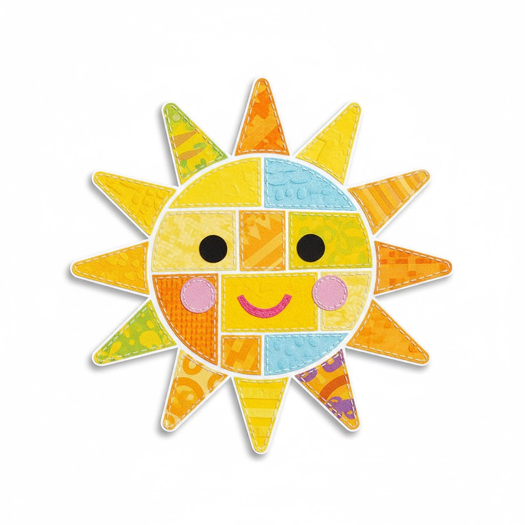 Paper cut-out art, [happy sun], a colorful collage of textured paper pieces, patchwork style, vibrant and playful colors, whimsical, graphic design, clean lines, white background, high detail, studio light